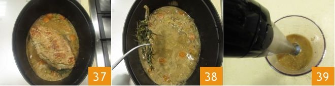 In the meantime, the veal will also be cooked 37, remove the rosemary sprig 38, pour the cooking liquid into a blender cup, and blend to obtain a smooth sauce 39.