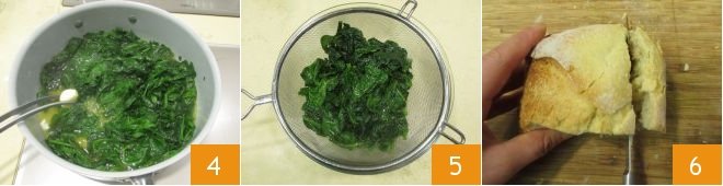 Once the spinach is soft, turn off the heat, remove the garlic clove 4 and drain the spinach in a colander to remove the excess water 5. Let the spinach cool and take the loaf of bread, remove the crust 6