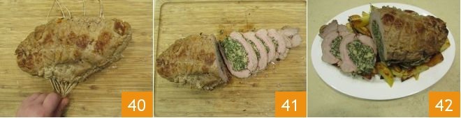 Take the stuffed veal pocket, remove the string 40, cut it into slices 41 and serve the hot meat accompanied by the potatoes 42 and the cooking sauce.