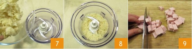 and place the crumb in the blender 7, blend to obtain a minced mixture 8. Cut the cooked ham into pieces 9,