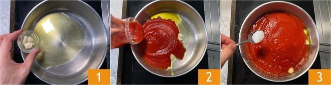To prepare the supplì alla norma, start with the sauce. In a saucepan, sauté three cloves of garlic in the extra virgin olive oil 1. Pour the tomato puree 2 and season with fine salt 3.