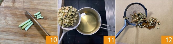 Meanwhile, take care of the eggplants. Cut them into cubes 10, fry them in seed oil at 320 degrees Fahrenheit for three minutes 11, and when they are beautifully golden, you can drain them on paper towels 12.