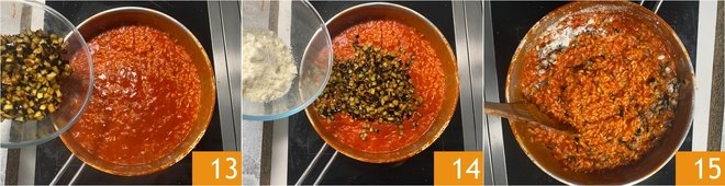When the rice is ready, add the fried eggplants 13, mix with the grated Parmesan cheese 14, and stir well to blend all the ingredients 15.