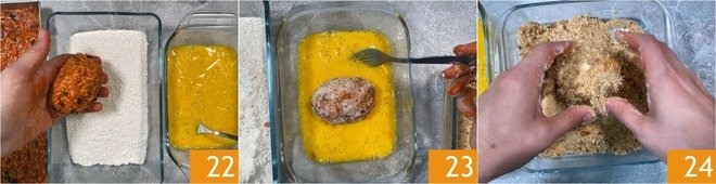 Take care of the breading of the supplì: first pass them in the flour 22, then in the beaten eggs 23, and finally in the breadcrumbs 24.