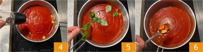 Flavor with a grind of black pepper 4 and fresh basil leaves 5. After about 20 minutes of cooking over low heat, remove the garlic cloves 6.