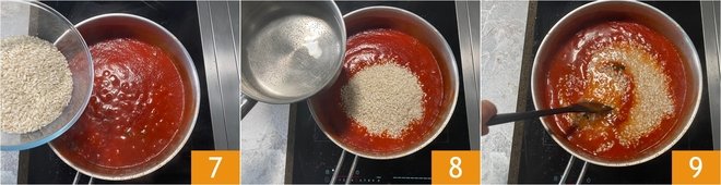 Now you can add the rice to the sauce 7, pour in the boiling water 8, and cook over medium-low heat for twenty minutes, stirring often 9. This way, the rice won't stick to the bottom and will absorb all the liquid.