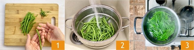 To prepare the sweet and sour green beans, first make sure to clean them well. Remove the side tips 1 and wash them well under running water 2. Boil them in lightly salted water for 12-15 minutes 3. The exact cooking time will depend on their size.