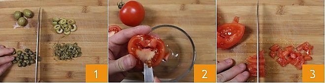 To prepare the swordfish rolls, start by preparing the filling: chop the olives and capers with a knife 1, cut the tomatoes in half, remove the seeds, then dice 3.