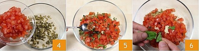 In a bowl, mix the breadcrumbs, capers, chopped olives, chopped garlic clove, and tomatoes 4, with half of a teaspoon of chili powder 5, fresh basil 6,