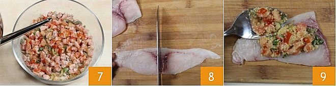 salt and season with a drizzle of oil 7. Prepare the swordfish: cut the slices of fish in half 8, fill each slice 9 with approximately 1 1/2 tbsp of the filling.