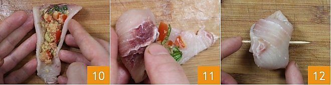 Fold the edges along the long side 10 of the fillet first so that the filling does not come out, roll 11 and hold the swordfish rolls together with toothpicks 12.