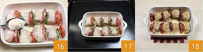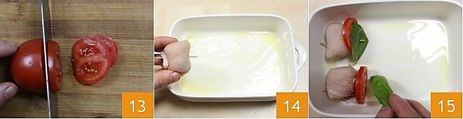 Cut the tomato into slices 13 and set them aside, oil an oven dish, place the rolls inside 14 place a slice of tomato and a basil leaf on top 15, and finish preparing the other rolls in this manner;