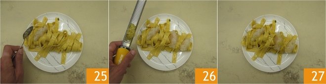 Now plate: roll the tagliatelle with kitchen tongs and transfer them to a plate. Using 2 teaspoons, shape the scampi tartare into quenelles and place 3 on each plate 25. Add the grated lemon zest 26 and serve 27!