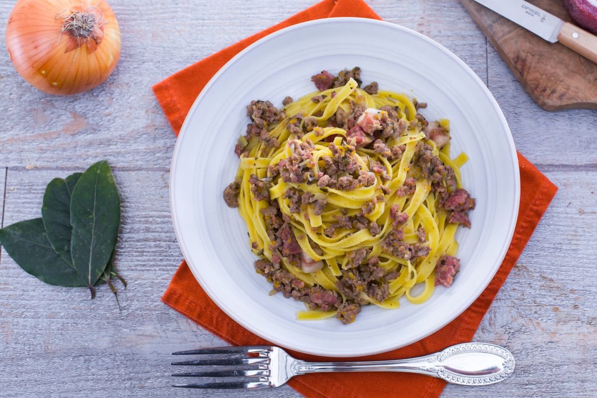 What extraordinary flavors and aromas are released from a good plate of tagliatelle with ragù! This time, however, we wanted to revisit this great classic, a must-have in every Sunday lunch, by offering you tagliatelle with white ragù, a version without tomato that is equally tasty and enriched with diced pancetta for a unique flavor that pairs perfectly with egg pasta. Rough and porous, the egg tagliatelle hold the appetizing meat and vegetable sauce, giving us emotions of rediscovered childhood memories. The choice of simple and genuine ingredients, the aroma of aromatic herbs, and a slow cooking over low heat make this dressing truly irresistible and also suitable for preparing lasagne, cannelloni, or savory crepes! Tagliatelle with white ragù is a tasty alternative to ragù alla bolognese or the classic genovese, but if you are looking for a new and original pairing, also try the very fresh Tagliatelle with bottarga, clams, and lemon!