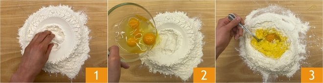 To make the caviar tagliolini, start with the fresh pasta: pour the flour onto the work surface, create a well in the center 1, and add the eggs gradually 2, combining them with a fork 3.