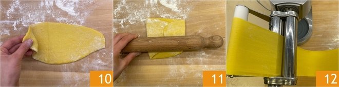Fold the outer flaps of the pastry towards the center 10, then flatten it again with a rolling pin 11, and pass it through the pasta machine several times, gradually reducing the thickness, until you reach the second-to-last setting 12.
