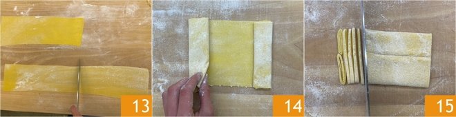 Cut out 3 rectangles from the obtained sheets 13 and dust with flour, then roll the short sides in towards the center 14. Slice the rolled dough into strips about 2-3 mm wide 15.