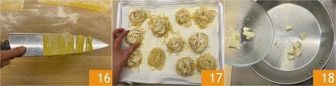 Lift the tagliolini with the blade of a knife 16, form them into nests, and place them on a tray dusted with semolina 17. At this point, bring a pot of water to a boil to cook the tagliolini. Meanwhile, melt the butter in a large skillet 18.