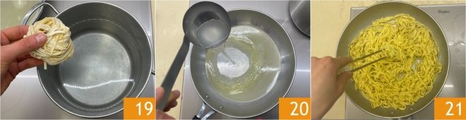 Submerge the nests of tagliolini and cook for 1-2 minutes 19. Meanwhile, pour a ladle of the cooking water into the pan with the melted butter 20 and stir to create an emulsion. Drain the tagliolini directly into the pan and toss them with the sauce 21.