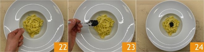 Garnish each plate with fennel 22 and 5g of caviar 23. Serve your caviar tagliolini 24 immediately!