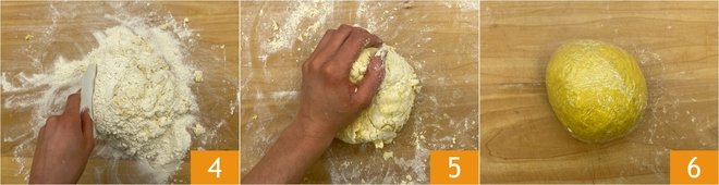 Use a pastry cutter to gather the entire mixture 4 and continue working with your hands 5 until you achieve a smooth and homogeneous dough. Wrap the dough in plastic wrap and let it rest in a cool place for 30 minutes 6.