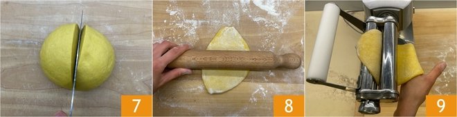 After the resting time, divide the dough in half 7 and flatten one of the two portions with a rolling pin on a floured surface 8. Then, pass it through the widest setting of the pasta machine 9; remember to wrap the unused portion of the dough in plastic wrap to prevent it from drying out.