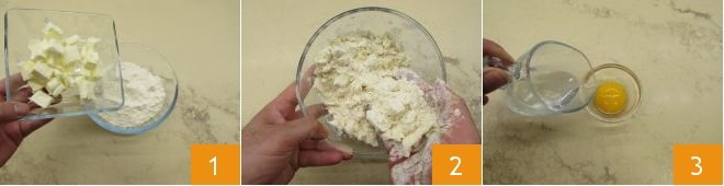 To prepare the tarte tatin first you have to make the brisée dough. Pour the flour and butter in chunks into a bowl at room temperature. Work quickly by creaming the butter and flour with your hands 2, until everything is mixed, but without heating it too much: you will have a grainy consistency 2. In another bowl pour the egg yolk, the water 3,