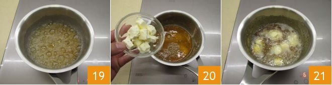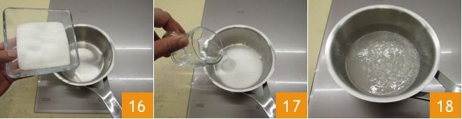 Take a saucepan with a thick bottom, pour the sugar 16 and just a drop of water 17; swirl it over the heat 18 and let the sugar caramelize just by swirling the saucepan and without stirring the sugar.
