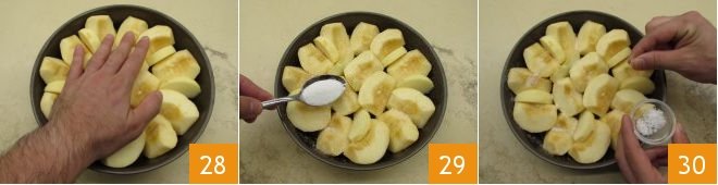 The apples should then be delicately pressed down as much as possible to cover the entire surface 28. For a better caramelization during cooking, sprinkle everything with a little additional sugar 29 and a pinch or two fo salt 30 which will both enhance the flavor.