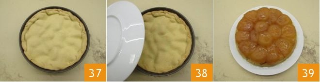 To avoid cutting away all the excess dough, fold the outside part slightly inwards so as to keep as much as possible, curling and pushing dough inwards with your thumbs 34: this will also make it thicker and give it a more solid base. Then remove the extra dough using the rolling pin 35 and pass the tip of your thumb between the inner edge of the pan and the brisée 36: this will help you to take out the tarte tatin more easily after baking. At this point, bake in a static oven preheated to 350° (180° C) for about 40-45 minutes.