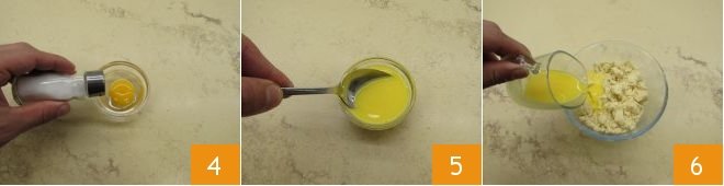 one or two pinches of salt 4 and mix everything with a spoon until the salt dissolves 5. Then pour the liquid ingredients into the midle of the bowl with the butter and flour 6,