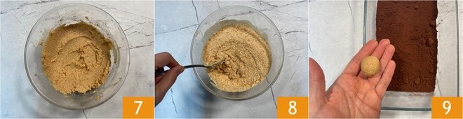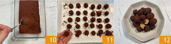 Roll it in cocoa powder, covering all sides well 10, and continue in this way until the mixture is finished; with these doses, you will get about 30 truffles. Arrange them on a tray 11 and place in the refrigerator for at least an hour (or in the freezer for 20 minutes) before serving. Your tiramisu truffles are ready to be enjoyed 12!