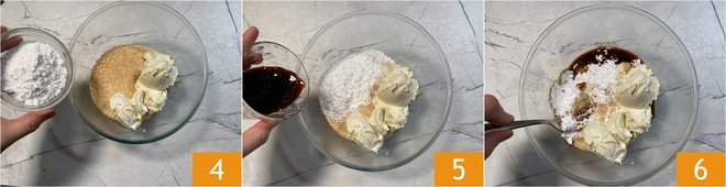 Transfer the cookie powder to a bowl, then add the mascarpone, powdered sugar 4, and coffee 5. Mix with a spoon 6.