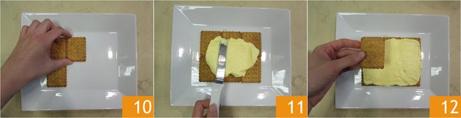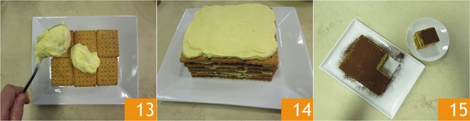 Spread 6 cookies on a rectangular plate 10, then spread two spoonfuls of the cream with a spatula 11. Once smooth, place another six coffee-soaked cookies on top 12.