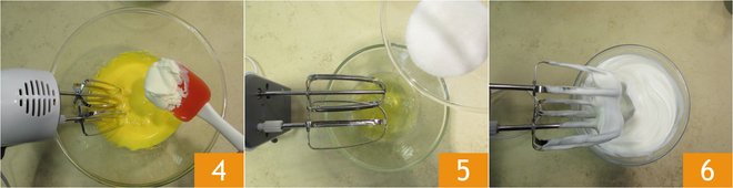 As soon as the mixture becomes clear and foamy, and with the beaters still running, you can add the mascarpone cheese, little by little 4. Once all the cheese has been incorporated, you will have obtained a dense and compact cream; set it aside. Clean the beaters well and move on to beating the egg whites, adding the remaining sugar little by little 5. You must beat them until stiff peaks form 6; you will achieve this result when, turning the bowl upside down, the mass does not move.