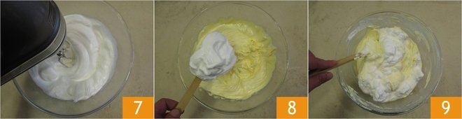 Whip the whites to stiff peaks 7; you’ll know they’re ready when you can turn the bowl upside down without the mixture moving. Take a spoonful of the whites and add it to the bowl with the mascarpone cream 8, then stir vigorously with a spatula to dilute the mixture. Next, add the rest of the egg whites little by little, folding them in by mixing very gently from the bottom upwards 9.