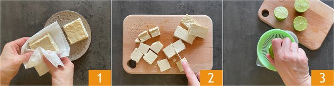 To prepare tofu nuggets, pat the natural tofu with absorbent paper in order to dry it well from its maintenance liquid 1, then cut it into cubes of about 3 cm 2 and transfer them to a bowl. Cut 2 limes in half and squeeze them 3.