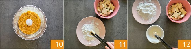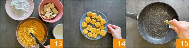 Blend coarsely 10 and transfer them to a plate. Take the tofu out of the refrigerator and pass each cube first in the potato starch 11 and then in the soy milk, taking care to immerse each side well 12.