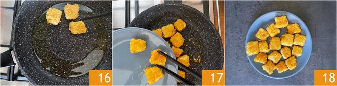 When it is hot, place the nuggets 16 and cook for 10 minutes always over high heat, turning them often to obtain an even browning and not to risk burning them. Serve the freshly prepared tofu nuggets 18!