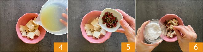 Pour the juice into the bowl with the tofu 4, add the peppercorns 5, a pinch of salt 6 and some ground pepper.
