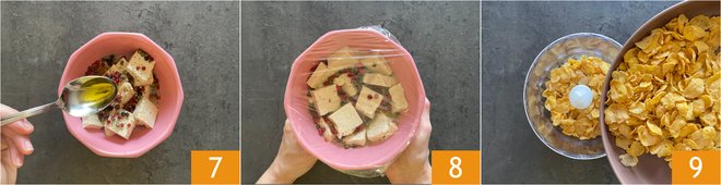 Also add a tablespoon of oil 7 and mix well. Cover the bowl with plastic wrap 8 and place in the refrigerator for 30 minutes to marinate. Meanwhile, pour the cornflakes into a blender 9.