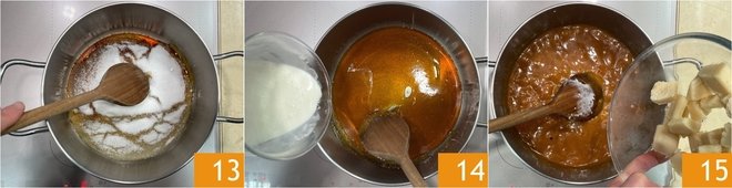 In the meantime, prepare the filling: pour 75 g of sugar into a saucepan and place it over medium-high heat without touching it. When the sugar begins to melt at the edges, you can lower the heat and stir with a wooden spoon until completely dissolved 13. Meanwhile, heat the cream in another saucepan until it is about to boil. When the sugar is almost fully dissolved, add the hot cream 14 and stir to combine. Then add the marzipan in pieces 15.