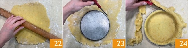 After the shortcrust pastry has rested, roll it out on a lightly floured surface to a thickness of 1/8 inch 22. Place a 6-inch diameter mold on the pastry and use it to cut out 2 discs, one for the base (which will also cover the edges) and one for the cover 23. Line the mold with the first disc of pastry and remove the excess with a knife 24.