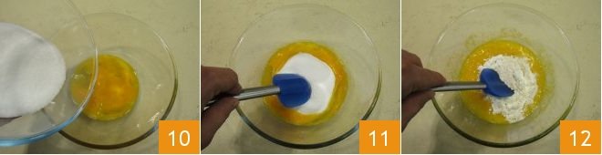 In a bowl, crack the 3 whole eggs and the yolk, pour the sugar 10, then mix the ingredients. When the sugar is absorbed, add the flour and the corn starch sifted in a sieve 12; mix well.