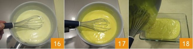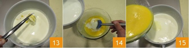 In the meantime, remove the lemon peel from the milk 13 and remove the pot from the heat to slightly dilute the eggs beaten with the sugar and dry ingredients with a little hot milk 14. Mix well, then put the pot of milk back on the stove and pour in the mixture with the eggs 15.