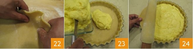 Make the bottom and edges adhere by pressing with your fingers 22 and eliminate the excess dough which you will use to make the top shell. Poke the bottom with the prongs of a fork and pour the custard which will have cooled in the meantime 23. Roll out the leftover shortcrust pastry and unroll the disc over the pan to cover it 24.