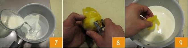 In the meantime, make the custard: place the milk 7 in a small saucepan, peel 1 lemon with a vegetable peeler, ensuring not to peel the bitter white part 8; add the peel to the milk and heat it over low heat (it should almost boil) 9.