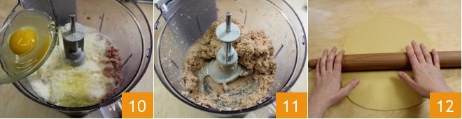nutmeg pepper to taste and the egg 10. Run the food processor again to mix all the ingredients 11. Add salt if necessary (both the ham and Parmesan cheese are quite salty), transfer the mixture to a bowl and let it cool completely. At this point take the fresh pasta and roll it out with a rolling pin (or a pasta machine) 12. You will need to make a thin sheet trying to preserve the moisture (do not overdo it when dusting with flour to roll it out it more easily). According to traditional rules the sheet should be about 0.6 mm thick (slightly less than half the thickness of a dime).
