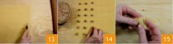 Using a smooth pastry cutter, remove the irregular edges (keep the scraps in plastic wrap film to usue later) and cut out squares measuring 1.6 inches (4 cm) per side 13. In the middle of each square of pasta, lay about .07 oz (2 g) of filling, now cold 14. Now you can start making tortellini pasta: take a square and fold it into a triangle, matching up the edges without pressing too hard (if the dough has dried slightly, lightly brush the edges with a little water) 15.