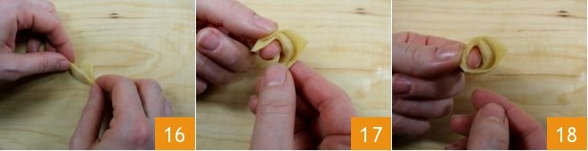 Pinch the two corners at the base of each tortellino 16 with your thumb and index finger and twist the edges around your index finger 17 exerting light pressure with your your thumb 18. Gently pull the tortellino off your finger and continue in the same way for all the others. Place the finished tortellini on a lightly floured cloth as you go. Let the tortellini pasta rest in a cool place.